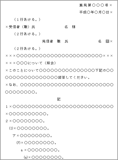 2 文書の種類を明らかにするため、標題の末尾に「(照会)」、「(報告)」等と記載すること。