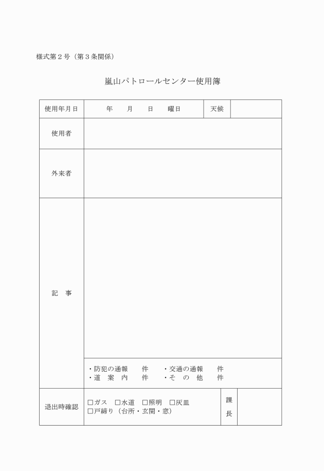 2 パトロールセンターを使用した者は、嵐山パトロールセンター使用簿(様式第2号)に所要事項を記入しなければならない。