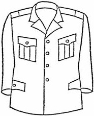 ボタン4個を一行につける。ポケットは胸部左右に各1個とふたをつけ金属製金色