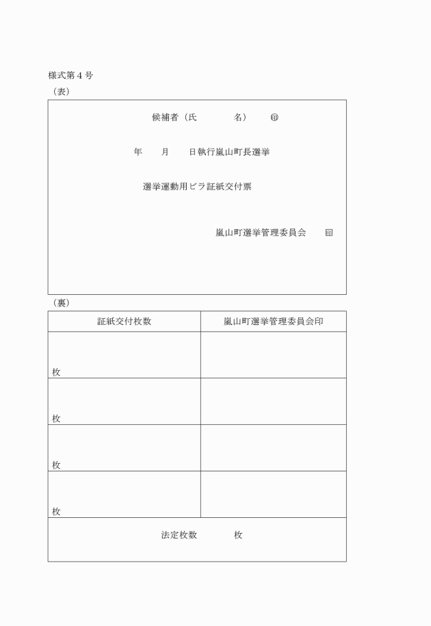 第6条 町長選挙における法第142条第1項第7号のビラは、町の選挙管理委員会が交付する別記様式第3号の証紙をはって頒布しなければならない。
