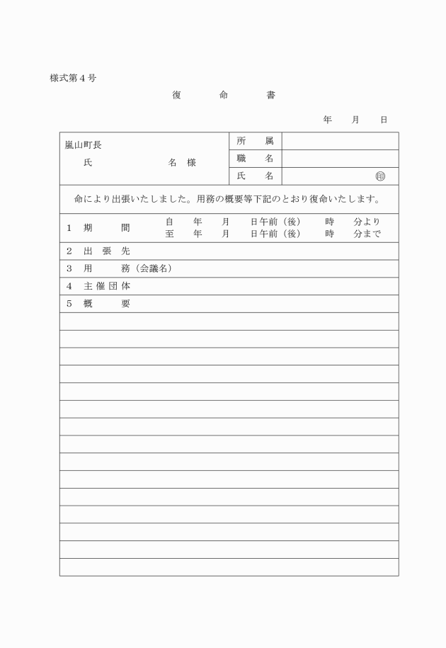 第16条 職員は、出張用務を終え帰庁したときは、直ちにその要領を口頭で報告し、軽易なものを除き、すみやかに復命書(様式第4号)を旅行命令権者に提出しなければならない。
