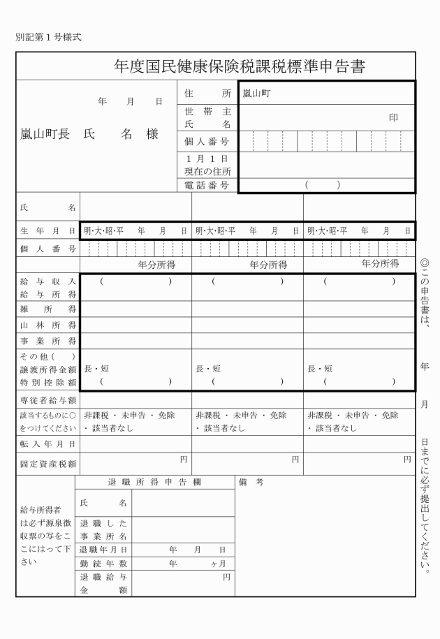 第2条 あらたに国民健康保険の被保険者(以下「被保険者」という。)の資格を取得した世帯主又は世帯内に被保険者の資格を取得した者がある場合においては、当該世帯主は、被保険者の資格を取得した日から10日以内に国民健康保険税(以下「保険税」という。)の算定の基礎に用いる前年中の総所得金額、退職所得の金額及び山林所得の金額と、当該年度に係る固定資産税のうち、土地及び家屋に係る部分の額を記載した申告書を提出しなければならない。