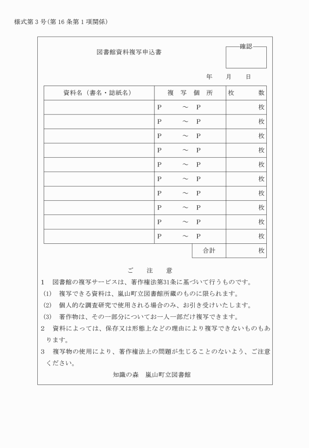 第16条 図書館資料の複写を依頼しようとする者は、図書館資料複写申込書(様式第3号)を館長に提出しなければならない。