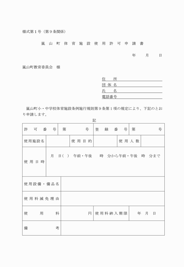 第9条 学校体育施設の使用の許可を受けようとする者は、嵐山町体育施設使用許可申請書(様式第1号。以下「申請書」という。)を教育委員会に提出しなければならない。