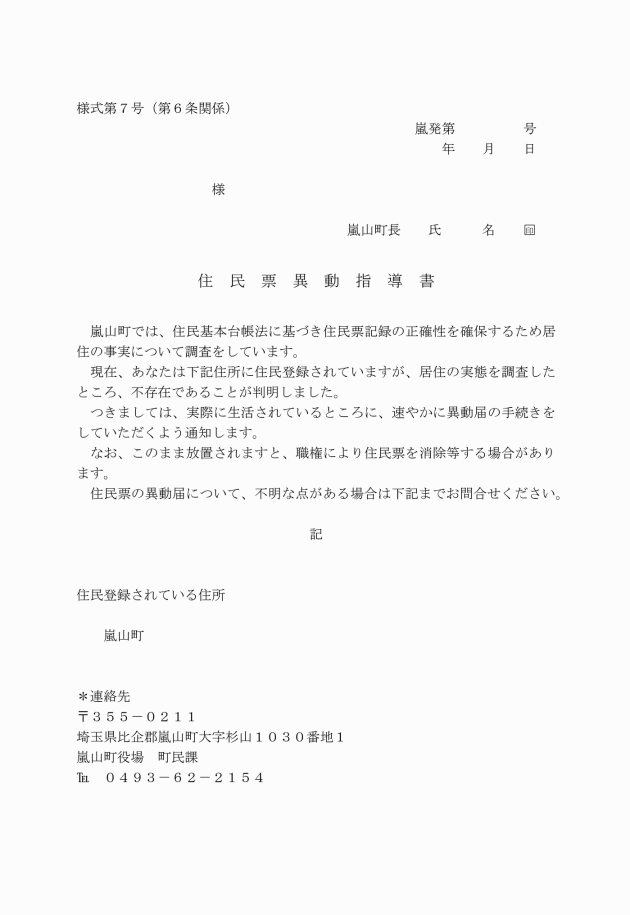 第7条 調査の結果、居住地が判明しない者又は前条の催告を行っても期限内の届出がない者については、住民基本台帳法施行令(昭和42年政令第292号)第12条の規定により職権で住民票の記載、消除等(以下「職権消除等」という。)を行うものとする。