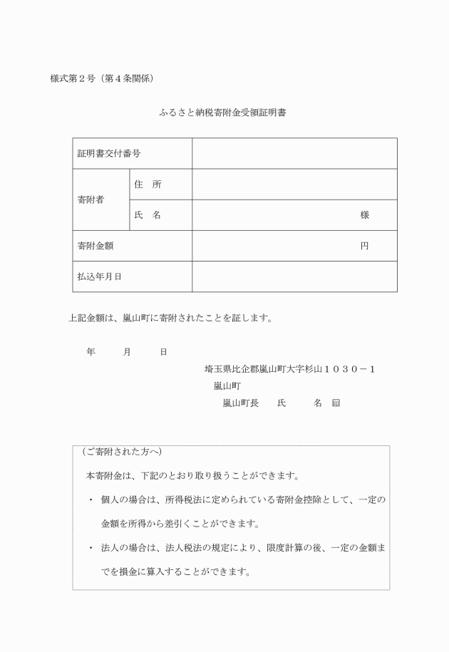 2 町長は、寄附金が納付されたときは、寄附者にふるさと納税寄附金受領証明書(様式第2号)を交付するものとする。