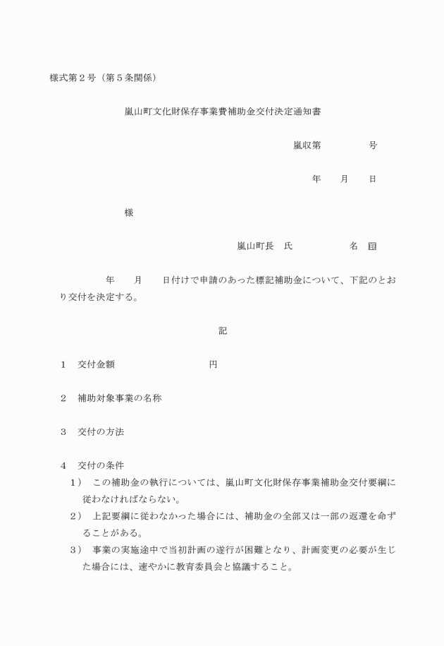 第1条 町は、文化財の保存を図るため、嵐山町文化財保護条例(昭和60年条例第9号)に基づき、指定文化財の所有者又は管理者等が実施する文化財保存事業に対し、予算の範囲内において補助金を交付する。