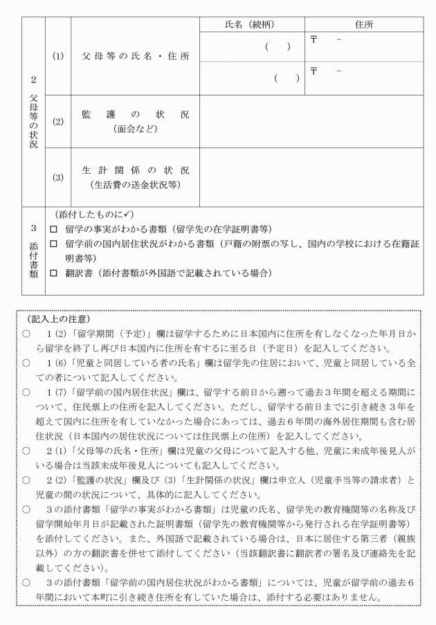 ウ 請求に係る児童が日本国内に住所を有しない場合は、規則第1条に規定される理由に該当するか否かを規則第1条の4第2項第2号の規定に基づき添付される書類(児童手当等に係る海外留学に関する申立書(様式第6号の3)、留学先の学校の在学証明書、留学前の日本国内での居住状況が分かる書類等)により確認すること。