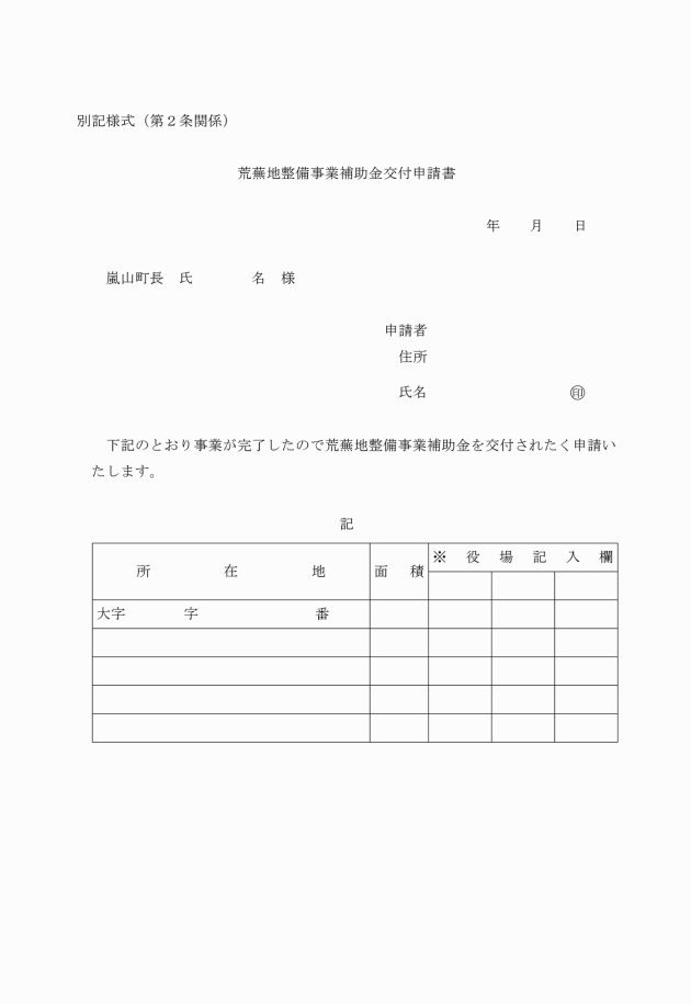 第1条 町は、市街化区域内及び特に町長が認めた地域内の荒蕪地から生ずる公災害を防止するため雑草等の刈取りを実施した区に対し、補助金を交付するものとする。ただし、町内に住居を有し生活する者が所有する土地については交付しない。