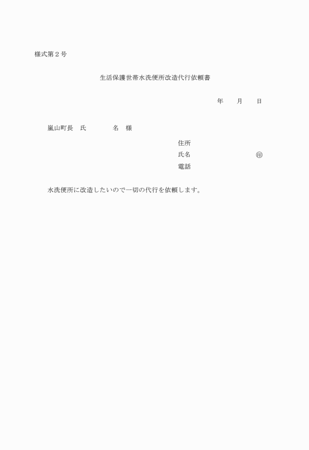 第6条 規則第4条第2項第5号に規定する町長の定める事項は、生活保護世帯水洗便所改造代行依頼書(様式第2号)とする。
