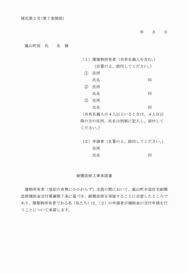 第7条 補助金の交付を受けようとする者(以下「申請者」という。)は、嵐山町木造住宅耐震改修補助金交付申請書(様式第1号)に次に掲げる書類を添えて、町長に提出しなければならない。