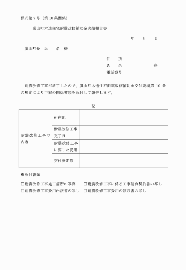 第10条 規則第12条の報告書の様式は、嵐山町木造住宅耐震改修補助金実績報告書(様式第7号)のとおりとする。