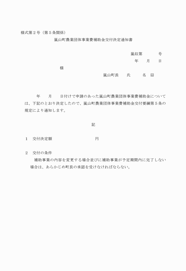 第7条 補助金の交付決定を受けた団体は、補助金の交付決定後、交付申請額に変更を生じた場合は、速やかに嵐山町農業団体事業費補助金変更交付申請書(様式第4号)を町長に提出しなければならない。