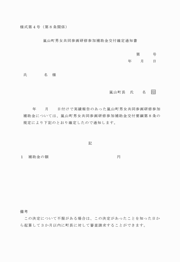 第5条 補助金の交付を受けようとする者(以下「申請者」という。)は、嵐山町男女共同参画研修参加補助金交付申請書(様式第1号)を町長に提出しなければならない。