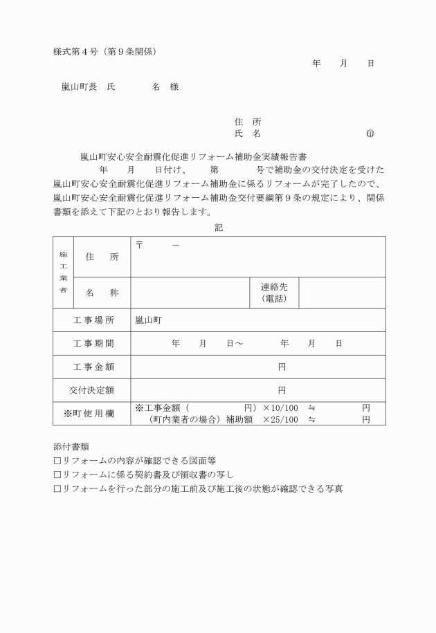 第11条 補助事業者は、確認通知書を受けたときは、嵐山町安心安全耐震化促進リフォーム補助金請求書(様式第6号)により、町長に補助金の請求をするものとする。