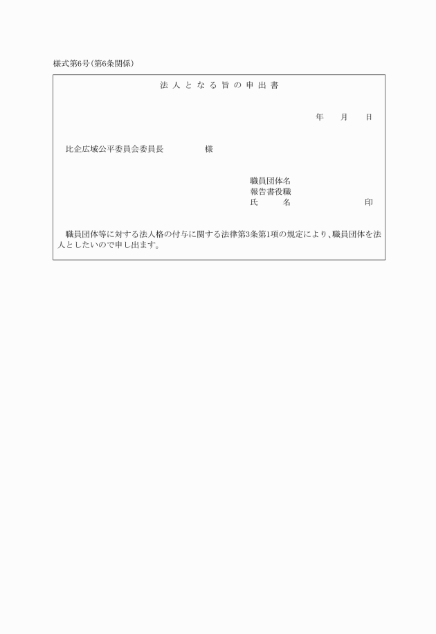 第6条 登録を受けた職員団体が、職員団体等に対する法人格の付与に関する法律(昭和53年法律第80号)第3条第1項の規定により法人となろうとする旨の申出をしようとする場合は、法人となる旨の申出書(様式第6号)に準じて作成した書面によらなければならない。