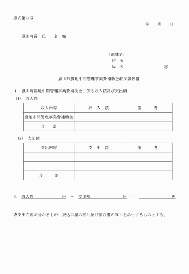 第12条 地域集積協力金を受領したものは、交付を受けた年度の翌年度の3月31日までの期間における地域集積協力金の収支を地域集積協力金収支報告書(様式第8号)に記載し、5月31日までに町長に提出するものとする。