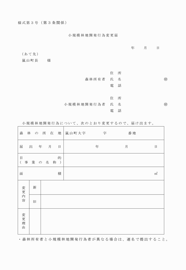 4 林地開発者は、計画書に係る事項を変更しようとするときは、あらかじめ小規模林地開発行為変更届(様式第3号)を町長に提出するものとする。
