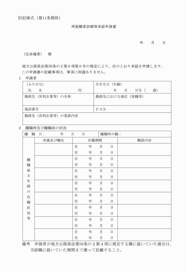 第11条 法第38条の2第6項第6号の承認を得ようとする再就職者は、再就職者依頼等承認申請書(別記様式)を任命権者に提出しなければならない。