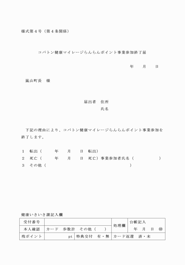 5 参加者が転出、死亡及びその他の理由で継続して事業に参加することができなくなった場合はコバトン健康マイレージらんらんポイント事業参加終了届(様式第4号)を提出しなければならない。
