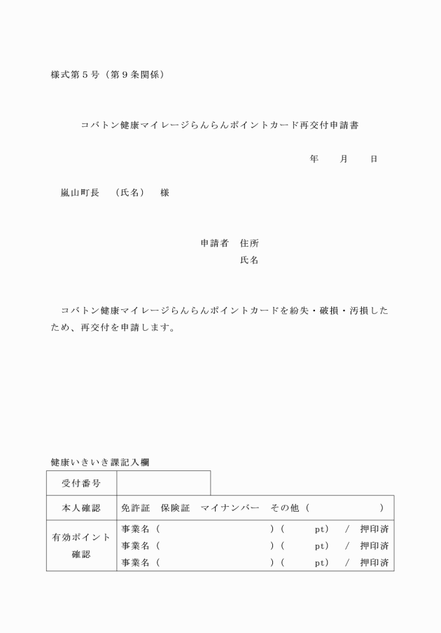 第9条 参加者は、カードを紛失、破損又は汚損したとき、又は記載事項に変更が生じたときは、町長にコバトン健康マイレージらんらんポイントカード再交付申請書(様式第5号)を提出し、カードの再交付を受けることができる。