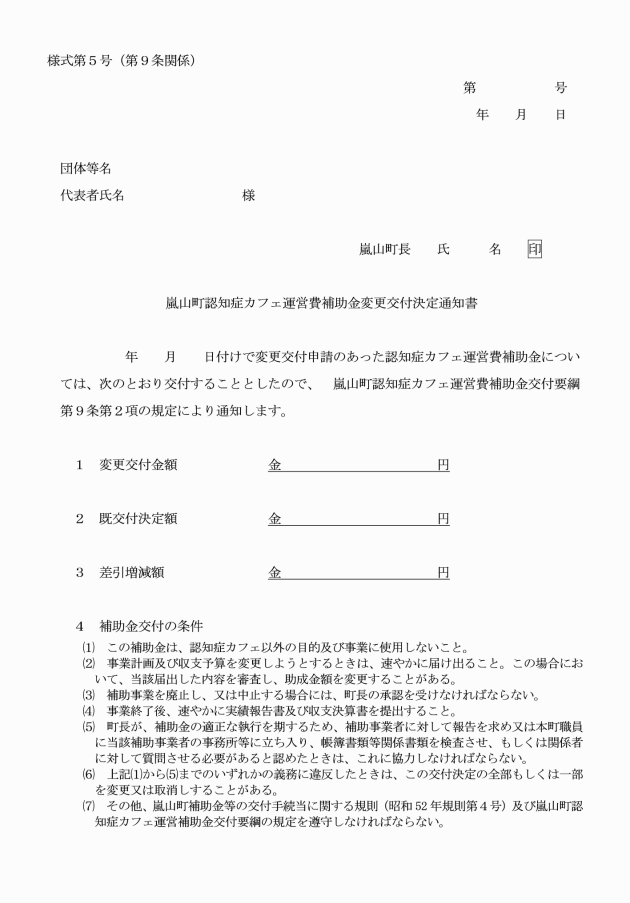 2 町長は、補助金の交付を決定したときは、嵐山町認知症カフェ運営費補助金交付決定通知書(様式第2号)により申請者に通知する。なお、交付決定に際し、必要な条件を付することができるものとする。