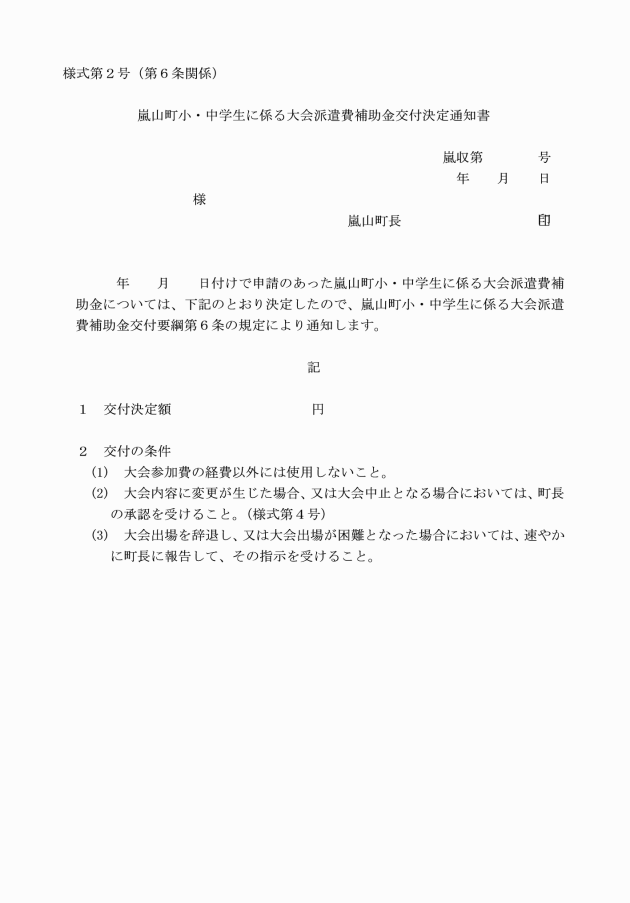 第5条 補助金の交付を受けようとする学校長は、嵐山町小・中学生に係る大会派遣費補助金交付申請書(様式第1号)に必要書類を添付して、町長に提出しなければならない。