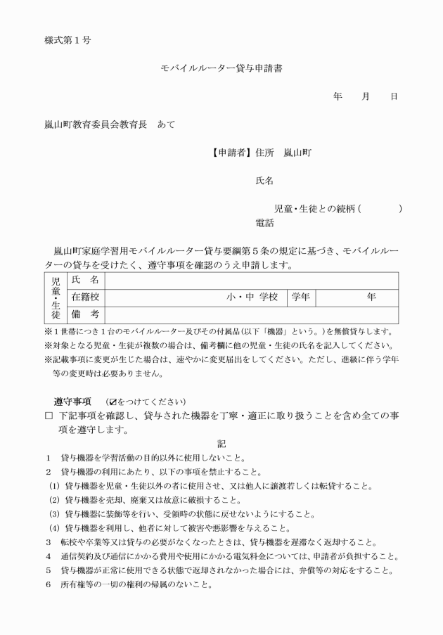 第5条 機器の貸与を受けようとする者は、モバイルルーター貸与申請書(様式第1号)により教育長に申請するものとする。