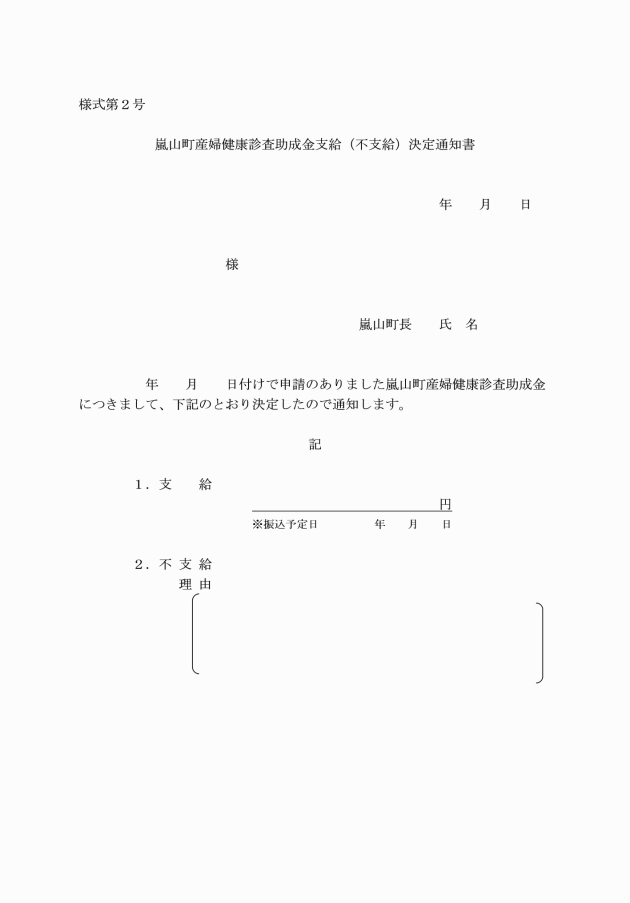 第2条 この要綱により助成を受けることができる者は、健診受診日において嵐山町に住所を有する産婦(流産及び死産の場合を含む。)とする。