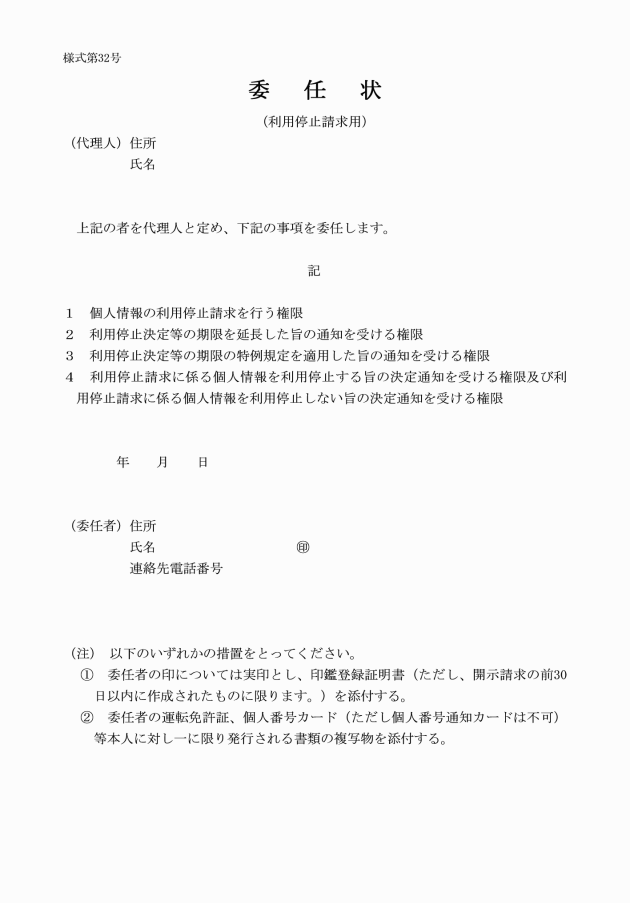 (32) 令第29条で準用する同第22条第3項の保有個人情報の利用停止請求に係る委任状 様式第32号の委任状