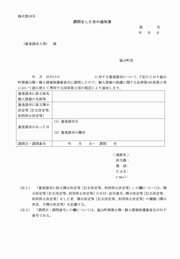 (38) 法第105条第3項で準用する同条第2項の規定による通知に係る書面 様式第38号の諮問をした者の通知書