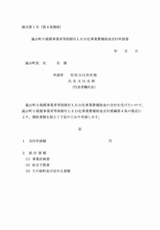 第4条 補助金の交付を受けようとする者(以下「申請者」という。)は、嵐山町小規模事業者等街路灯LED化事業費補助金交付申請書(様式第1号)を町長に提出しなければならない。